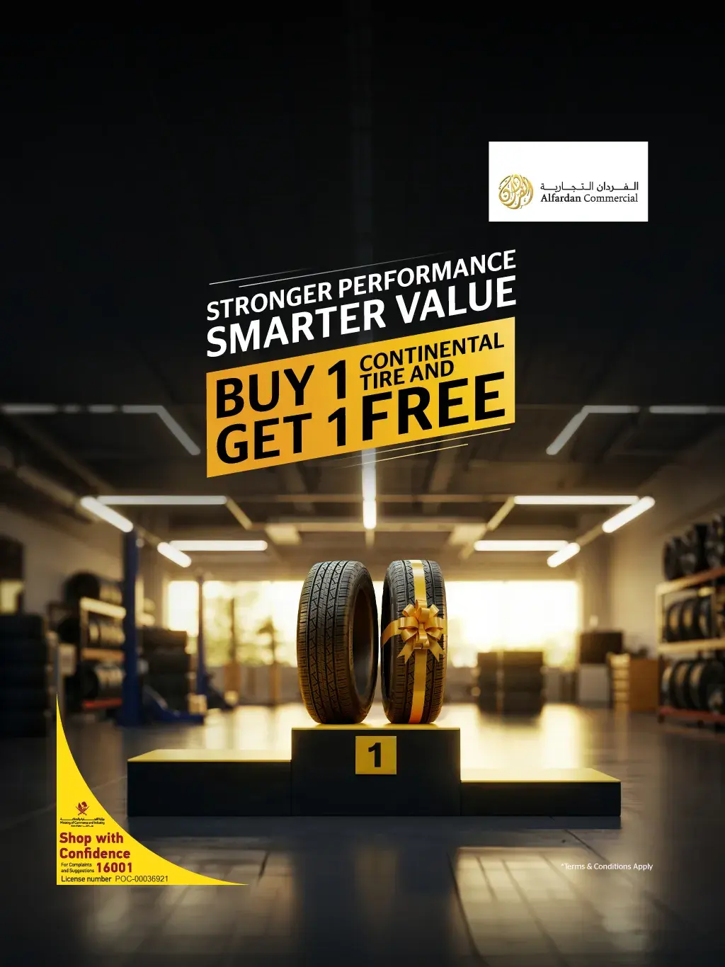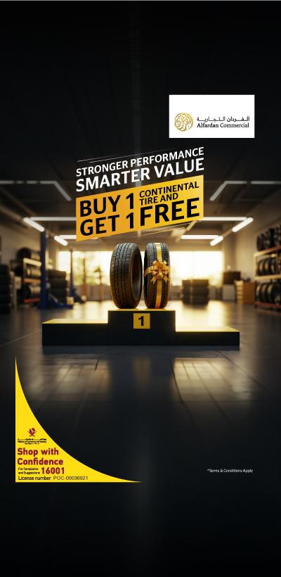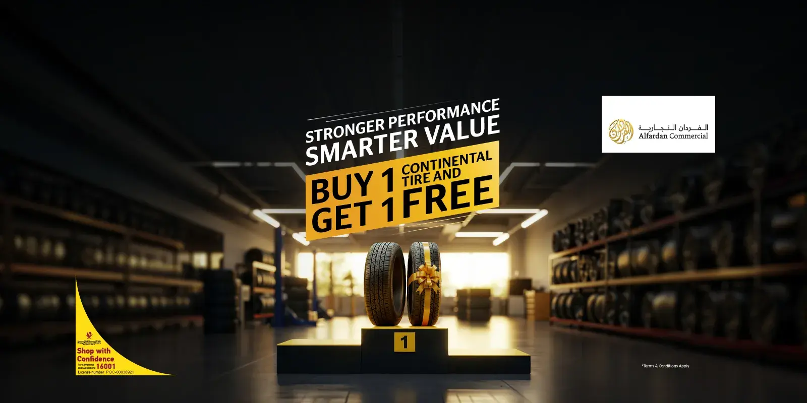 Summer's here and your tires shouldn't hold you back. From April 1st to April 30th, 2026, Alfardan Commercial is running Qatar's hottest tire deal: buy any 1 Continental Tire and get the 2nd one completely FREE. That's half the cost. Double the confidence. Zero compromise on quality.